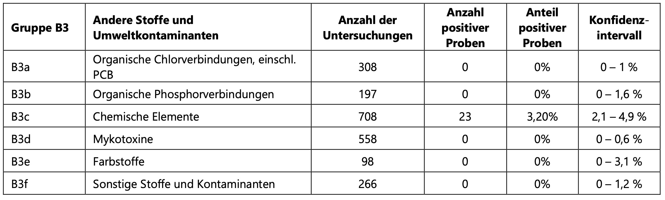 Auch bei der Untersuchung auf Stoffe der Gruppe B wie Stoffe mit antibakterieller Wirkung (B1), Anthelminthika (B2a), Kokzidiostatika (B2b), Carbamate und Pyrethroide (B2c), Beruhigungsmittel (B2d), sonstige Stoffe mit pharmakologischer Wirkung (B2f), organische Chlorverbindungen, einschl. PCB (B3a), organische Phosphorverbindungen (B3b), Mykotoxine (B3d), Farbstoffe (B3e), und sonstige Stoffe und Kontaminanten (B3f) wurden keine positiven Rückstandsbefunde festgestellt.