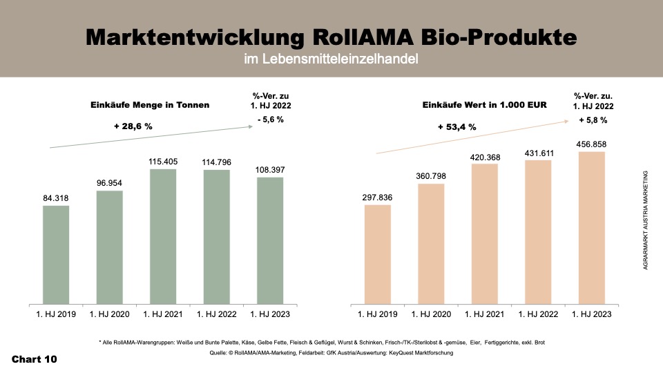 Die Bio-Frischwarenumsätze (exkl. Brot und Gebäck) betrugen im Lebensmitteleinzelhandel laut RollAMA-Haushaltspanel im ersten Halbjahr 2023 rund 460 Mio. Euro, was einem Zuwachs von sechs Prozent entspricht. Die eingekauften Mengen sanken hingegen um ebenfalls sechs Prozent im Vergleich zur Vorjahresperiode (Chart 10).