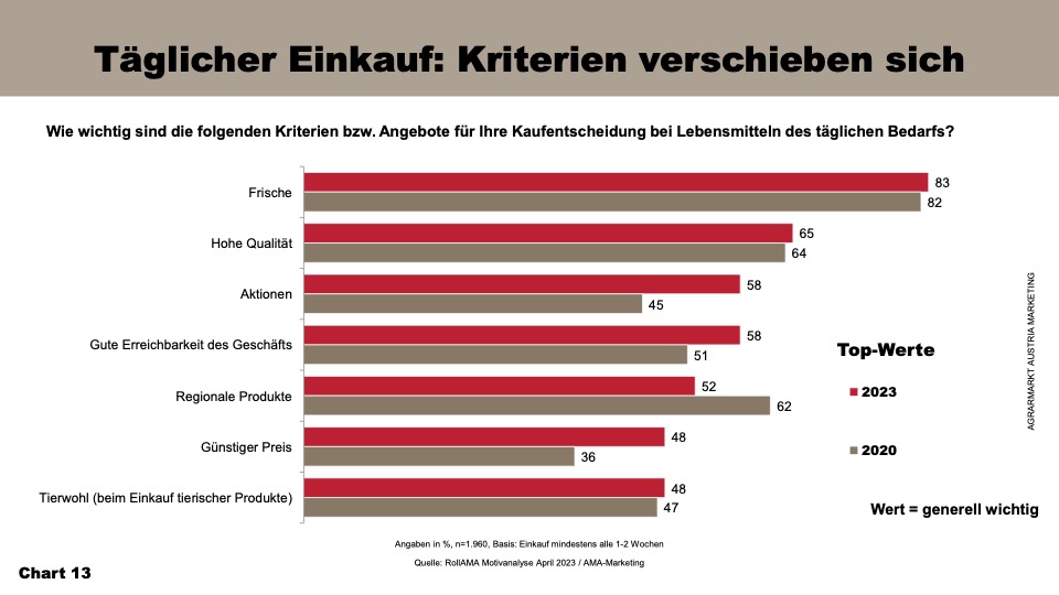 Frische (83 %) und hohe Qualität (65 %) stehen zwar nach wie vor an erster bzw. zweiter Stelle bei der Frage nach den Kriterien für die Kaufentscheidung, gefolgt von Aktionen, die für 58 Prozent der Befragten relevant sind. Sie sind jedoch wichtiger als konstant günstige Preise. Das weist darauf hin, dass rabattierte Preise vor allem eine psychologische Wirkung haben und der Wert von Lebensmitteln nicht grundsätzlich in Frage gestellt wird. (Chart 13).