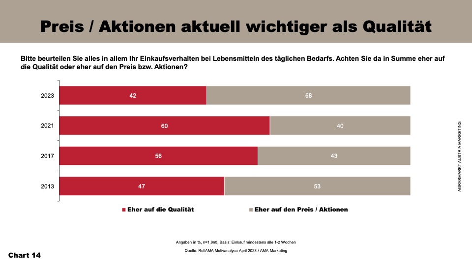 Allerdings geben die befragten Konsumentinnen und Konsumenten an, dass der Preis bzw. Aktionen in ihrem tatsächlichen Einkaufsverhalten insgesamt wichtiger sind als die Qualität: 58 Prozent sagen, dass sie in Summe eher auf den Preis oder Aktionen achten als auf die Qualität (42 %) der Lebensmittel. Im Vergleich zu einer Motivanalyse aus 2021 ist das eine starke Verschiebung: Damals gaben 60 Prozent der Teilnehmerinnen und Teilnehmer an, eher auf Qualität zu achten als auf den Preis (40 %) (Chart 14).
