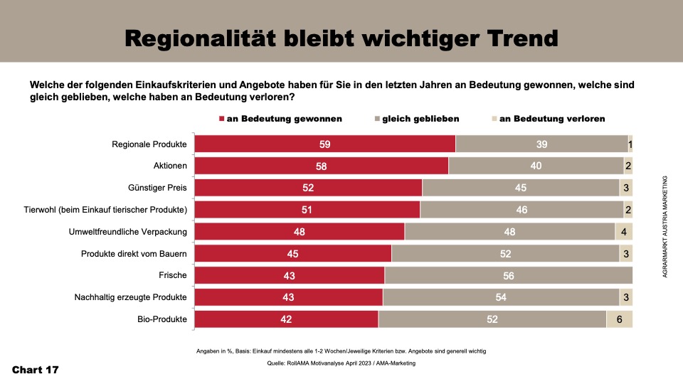Regionalität bleibt ein wichtiger Trend, der für knapp 60 Prozent der Befragten an Bedeutung gewonnen hat. Ebenso dringen langfristig Kriterien der Nachhaltigkeit wie Tierwohl und umweltfreundliche Verpackung ins Bewusstsein der Konsumentinnen und Konsumenten (Chart 17).