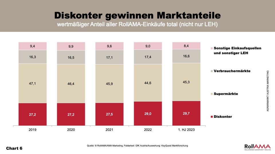 Leichte Verschiebungen gab es in den Marktanteilen in den unterschiedlichen Vertriebsschienen im Lebensmitteleinzelhandel (LEH): Diskonter und Supermärkte erhöhten ihre Marktanteile auf 29,7 bzw. 45,3 Prozent und gewinnen damit zu Lasten der Verbrauchermärkte und sonstiger Einkaufsquellen* (Chart 6).