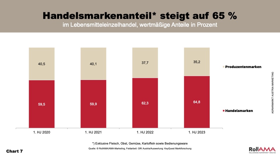 Als Reaktion auf die steigenden Preise forciert der Lebensmittelhandel seine Eigenmarken und setzt verstärkt auf Aktionen. Unter den in der RollAMA erfassten Produktgruppe (exklusive Fleisch, Obst, Gemüse und Kartoffeln sowie Bedienungsware) liegt der Handelsmarkenanteil bei 65 Prozent (Chart 7).