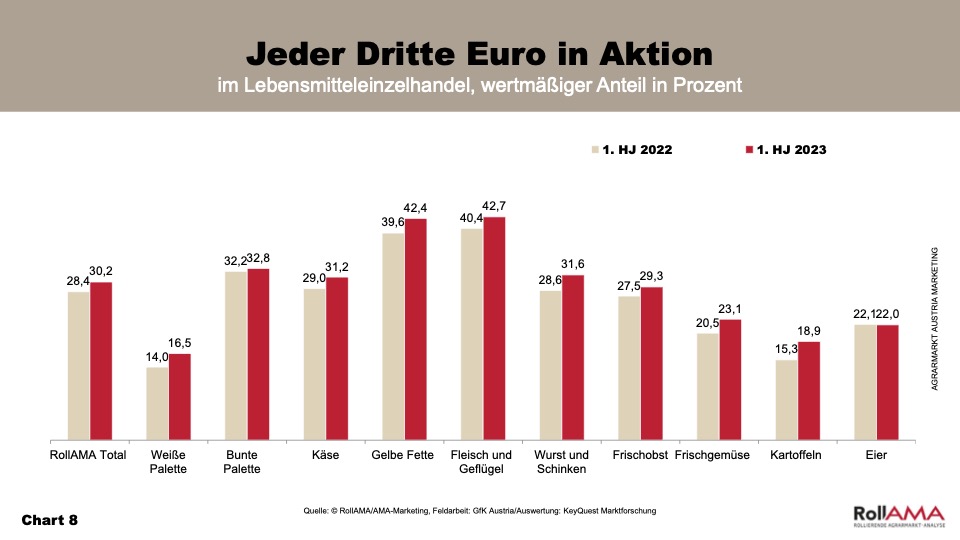 Mittlerweile fließt auch jeder Dritte im LEH ausgegebene Euro in ein Aktionsprodukt – Butter und Fleisch werden sogar über 40 Prozent in Aktion gekauft (Chart 8).