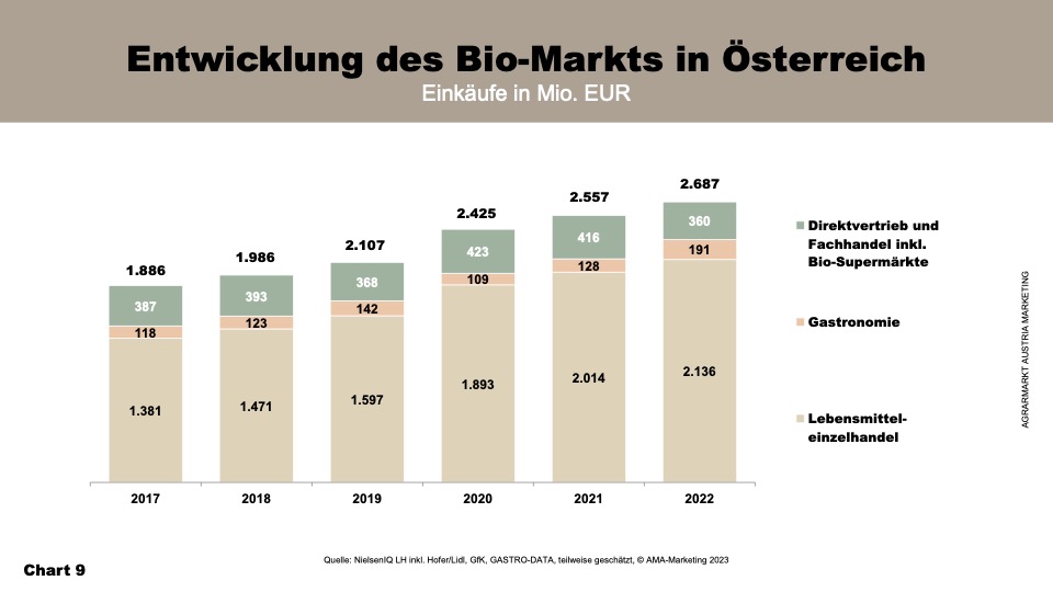 Insgesamt wurden 2022 in Österreich Bio-Lebensmittel (über alle Vertriebsquellen hinweg) im Wert von rund 2,7 Mrd. Euro abgesetzt, was 500 Mio. Euro mehr als vor der Corona-Krise entspricht (Chart 9).