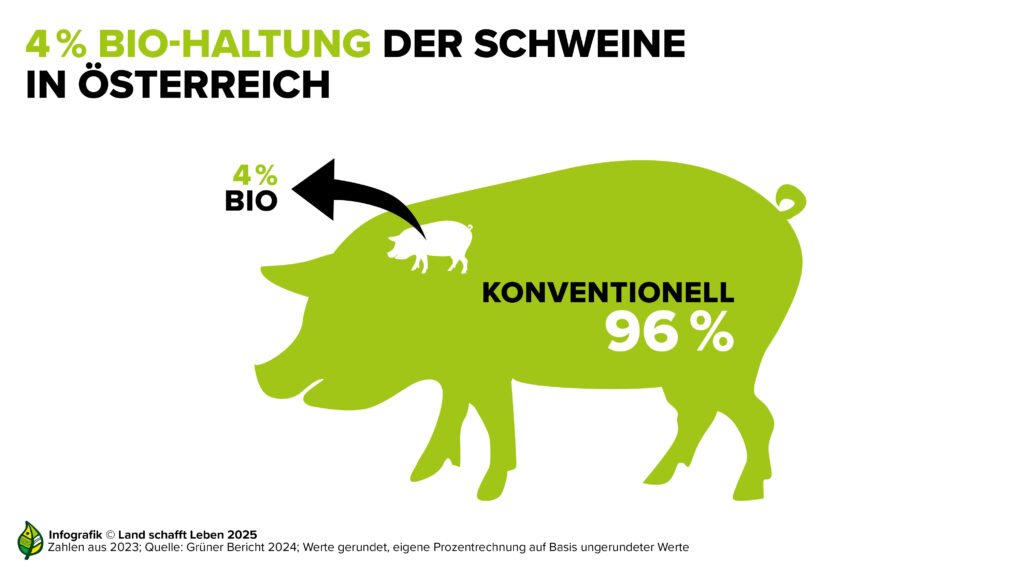 Beim Schwein bewegt sich der Bio- und Tierwohlanteil aktuell bei rund acht Prozent. Damit ist er in den vergangenen Jahren zwar langsam, aber dennoch gestiegen. Insgesamt zeigen die Zahlen jedoch, dass zwischen dem Wunsch nach mehr Tierwohl und unserem tatsächlichen Einkaufsverhalten noch eine große Lücke klafft. Immerhin gab in einer Befragung der RollAMA der AMA-Marketing rund jede zweite befragte Person an, dass ihr Tierwohl wichtig sei. Hannes Royer, Gründer des Vereins Land schafft Leben, sagt dazu: „Viele von uns wünschen sich bessere Haltungsbedingungen für Schweine, das zeigt sich auch deutlich in Umfragen. Im Supermarkt werfen wir unsere Prinzipien aber ganz schnell wieder über Bord. Ein Blick auf das Preisschild genügt und schon entscheiden wir uns gegen Tierwohl und für den billigsten Preis. Das führt dazu, dass es mittlerweile einige Betriebe gibt, die gerne für Tierwohl-Programme produzieren wollen, das aber nicht tun können, weil es zu wenig Nachfrage nach Tierwohl-Fleisch gibt. Das ist absurd.“