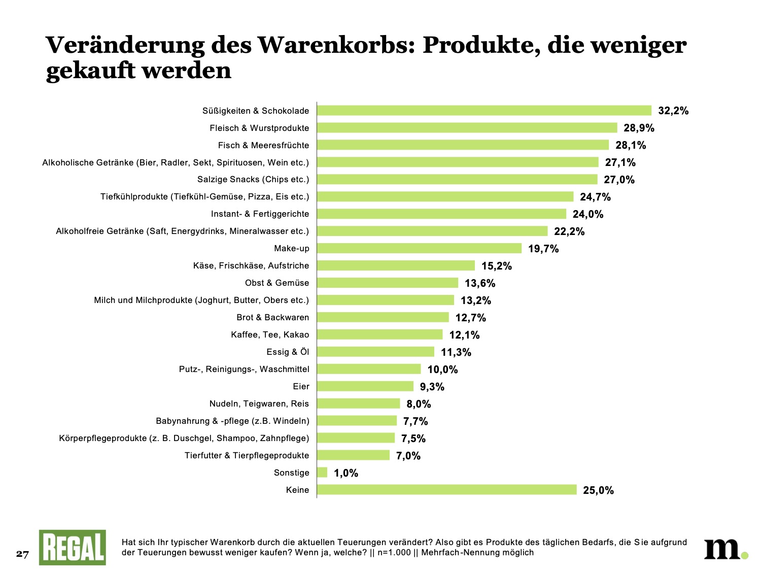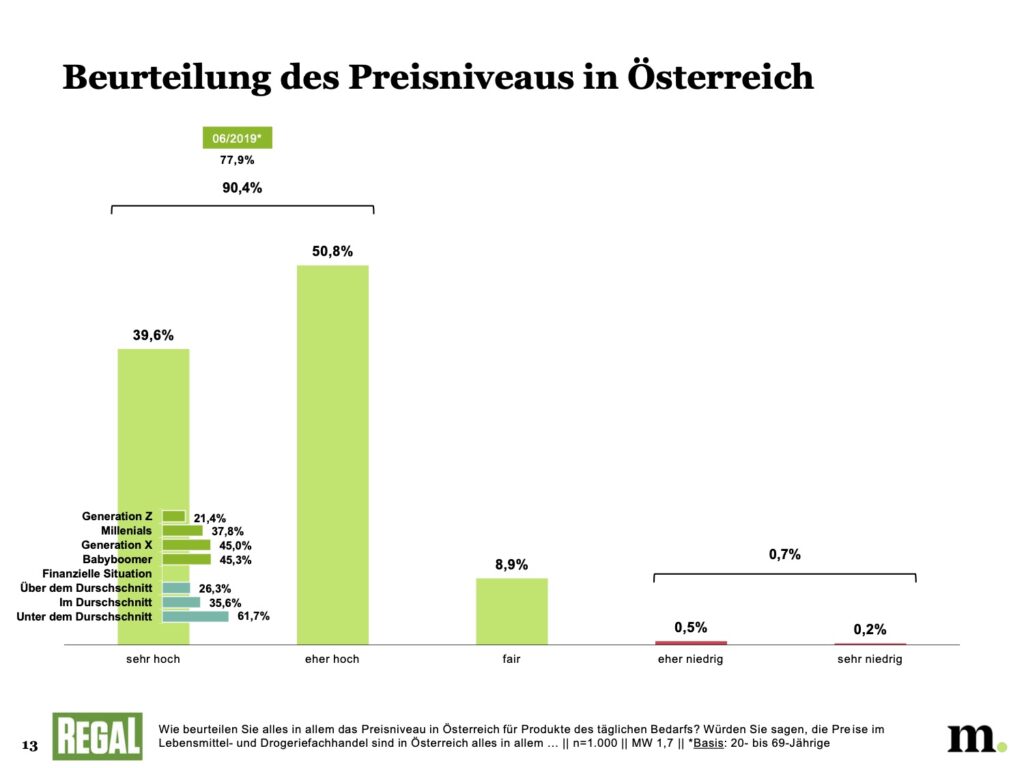 Runtergebrochen auf einen typischen Warenkorb ergibt sich ein wahrgenommener Preisanstieg von durchschnittlich 27%. Die Österreicherinnen und Österreicher schätzen also, dass die Kosten für einen normalen Einkauf aktuell um mehr als ein Viertel höher sind als im Vorjahr.