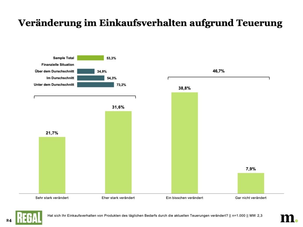 Da den Teuerungen nicht zu entkommen ist, gibt jede*r zweite Befragte an, als Konsequenz das eigene Einkaufsverhalten sehr oder eher stark an die neue Situation anzupassen. Der Handel nimmt sogar noch deutlichere Veränderungen wahr. Die befragten Expert*innen gehen von 76% aus, die ihr Verhalten in den Geschäften umgestellt haben.