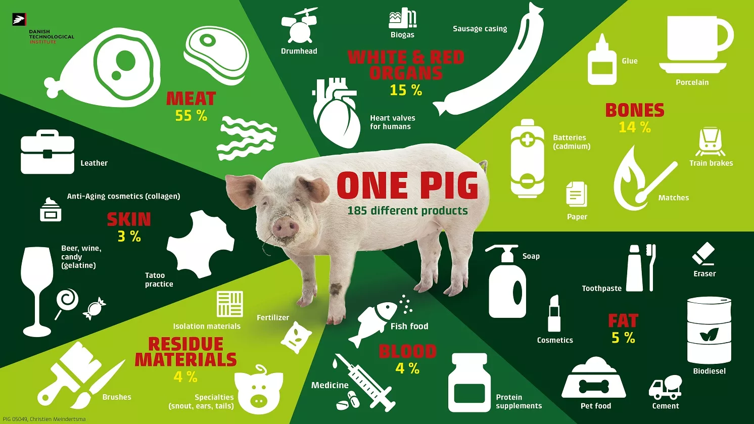 Häufig wird die Viehzucht primär im Kontext der Nahrungsmittelproduktion betrachtet. Doch ihr Beitrag erstreckt sich weit über die Bereitstellung von Nahrungsmitteln hinaus. Teile eines Schweins und verschiedene Nebenprodukte fließen in über 180 unterschiedliche Produkte ein – darunter Medikamente, Kosmetika, Batterien, Biogas, Isolationsmaterialien, Zement, Seifen und vieles mehr.