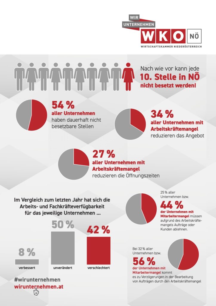 Eine neue, repräsentative Umfrage unter 1.400 niederösterreichischen Unternehmen von der KMU Forschung Austria im Auftrag der Wirtschaftskammer Niederösterreich zeigt den aktuellen Umfang des Mitarbeitermangels in Niederösterreich auf. „Bereits 54% aller Unternehmen haben dauerhaft nicht besetzbare Stellen. Wobei sich die Situation im Vergleich zum Vorjahr für 42% der Betriebe verschlechtert und nur für 8% verbessert hat“, führt Harald Mahrer, Präsident der Wirtschaftskammer Österreich, im Rahmen einer Pressekonferenz bei seinem Niederösterreich-Tag aus.