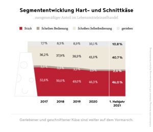 Im Milchsegment konnte insbesondere Käse zulegen. Der langjährige Trend zu geschnittenem und geriebenen Käse setzt sich auch in diesem Halbjahr fort.