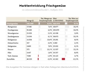 Bei Gemüse sind die Vorzeichen über alle Kategorien positiv. Diese Warengruppe hat sich in den letzten zwei Jahren am besten entwickelt. Einzig bei Erdäpfeln führten niedrigere Preise zu starken Umsatzverlusten gegenüber dem Vorjahr.
