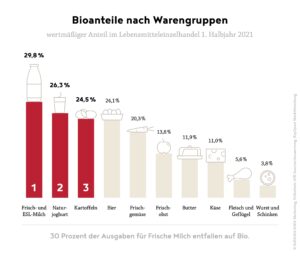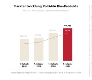 Weiterhin dynamisch bleibt die Entwicklung am Biomarkt. Die Ausgaben für Bioprodukte stiegen im Vergleich zum Vorjahr um fast 17 Prozent. Der Bioanteil an den in der RollAMA erfassten Frischeprodukten erreichte elf Prozent. Im Ranking der Produkte mit dem höchsten Bioanteil führen Frischmilch, Naturjoghurt und Kartoffeln.