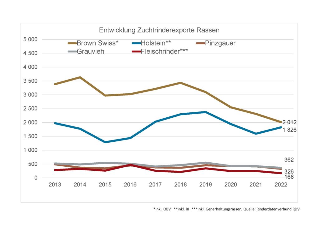 Im Jahr 2022 wurden 23.919 Zuchtrinder exportiert, um 717 Stk. oder 3,1 % mehr als im Vorjahr. Davon wurden 55 % innerhalb der Europäischen Union vermarktet, die restlichen 45 % nach Drittländern. Italien ist jenes Land mit den meisten importierten österreichischen Zuchttieren. Das Land ist schon seit jeher ein wichtiger Handelspartner der heimischen Rinderwirtschaft und Rinderzucht.