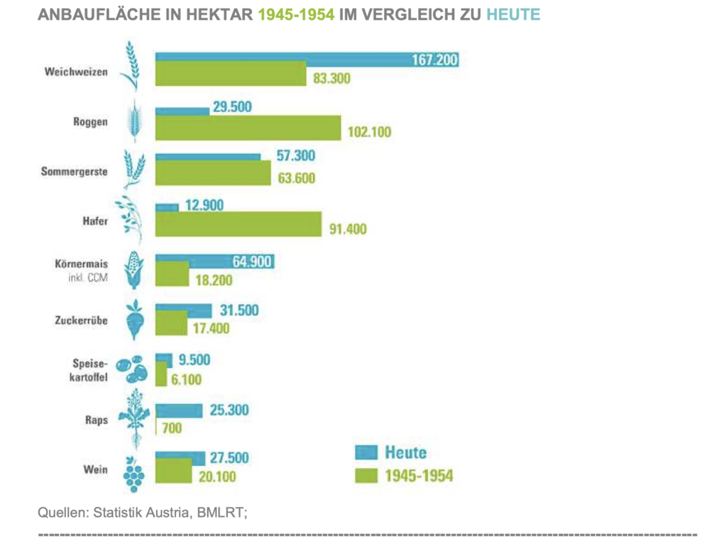 Mit dem Zerfall der Monarchie nach dem Ersten Weltkrieg waren die großen Kornkammern, wie Ungarn, Polen und Westrumänien, weggebrochen. Großes Ziel war die Bevölkerung mit Lebensmitteln zu versorgen. Diese Herausforderung konnte nur durch eine effizientere landwirtschaftliche Produktion im eigenen Land gemeistert werden. Mit dem Anschluss Österreichs an Deutschland verlor 1938 das Prinzip der gesetzlichen Interessenvertretung seine Gültigkeit. Erst 1945 erhielten die österreichischen Rechtsvorschriften wieder ihre Wirkung. Damit gab es auch wieder eine Landwirtschaftskammer und erneut die dringliche Aufgabe, die hungernde Bevölkerung zu ernähren. Der Wiederaufbau der Landwirtschaft nach dem Zweiten Weltkrieg war schwierig. Es mangelte praktisch an allem. Bauernhöfe waren zerstört, der Viehbestand dezimiert. Es fehlte an den notwendigsten Betriebsmitteln. Bezirksbauernkammern mussten erst wieder funktionsfähig gemacht werden. Hamsterkäufe und Schwarzhandel verursachten irreguläre Marktzustände. Die Landwirtschaftskammer strebte eine Harmonisierung von Produktion und Bedarf an. Dabei halfen die 1950 eingeführten Marktordnungsgesetze, die erstmals Maßnahmen zur Preisregulierung vorsahen. Bei witterungsbedingten Ertragsverlusten unterstützt seit 1947 die Hagelversicherung. Mit der wirkungsvollen Starthilfe durch den „Marshallplan“ wurde das Ziel der Kammer erreicht: weitgehende Selbstversorgung und sogar ansteigender Agrarexport. Große Veränderungen brachte der EU-Beitritt 1995. Die nationalen Marktregelungen wurden von der Gemeinsamen EU-Agrarpolitik abgelöst. Die zunehmende Professionalisierung der Betriebe forderte auch eine Professionalisierung der Beratung. Heute zählen unter anderem auch die Anpassung an den Klimawandel und der Dialog mit den Konsumenten zu den primären Aufgaben der Bauernvertretung.
