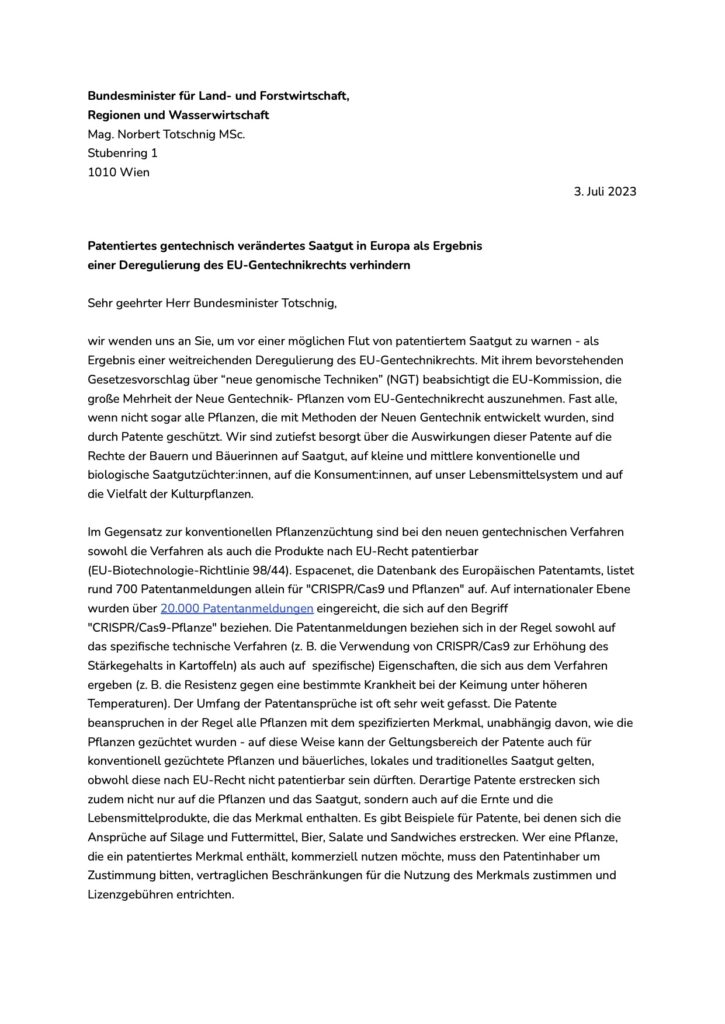 In Österreich unterzeichneten ReinSaat GmbH, ARCHE NOAH, IG Saatgut, die bäuerlichen Organisationen BIO AUSTRIA Erde & Saat sowie ÖBV – Via Campesina Austria, ARGE Gentechnik-frei, die Arbeiterkammer, FIAN Österreich und GLOBAL 2000 den Offenen Brief an Landwirtschaftsminister Norbert Totschnig.