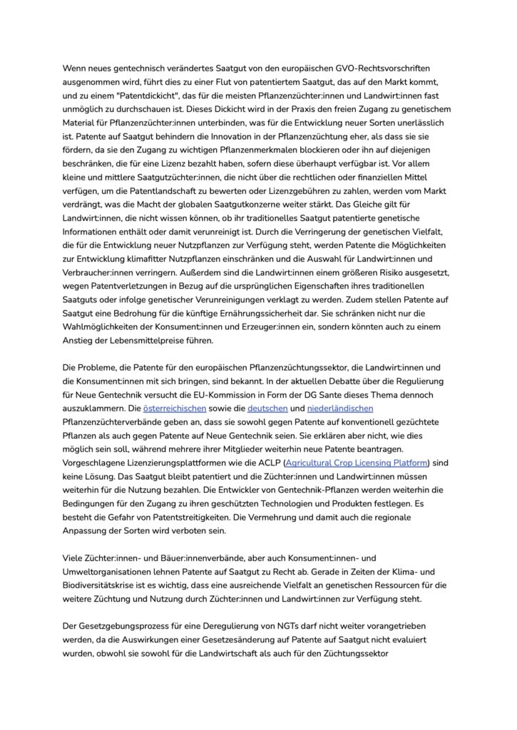 „Wenn das EU-Gentechnikrecht dereguliert wird, wird es in der EU zu einer Flut von patentiertem Saatgut kommen, die sowohl gentechnisch verändertes als auch konventionelles Saatgut umfassen wird“, warnen die Unterzeichner:innen. „Dies hätte schwerwiegende Folgen, vor allem für kleine und mittlere Saatgutzüchter:innen, Bäuer:innen, Lebensmittelhersteller:innen und Verbraucher:innen.“