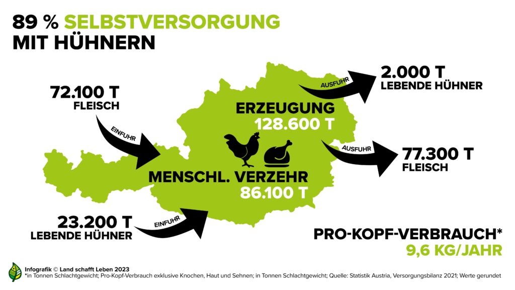 Obwohl sich Österreich fast zu 90 Prozent selbst mit Hühnerfleisch versorgen könnte, wurde 2021 knapp die Hälfte des Bedarfs aus anderen Ländern importiert – unter anderem aus Deutschland, Ungarn und Polen. Gleichzeitig wurde fast dieselbe Menge exportiert, wobei Re-Exporte hier eingeschlossen sind. Dennoch tauschen wir einen Teil unseres eigenen, hochwertigen Hühnerfleisches gegen solches aus anderen Ländern aus, wo wir keinen Einfluss auf die Produktionsbedingungen haben.