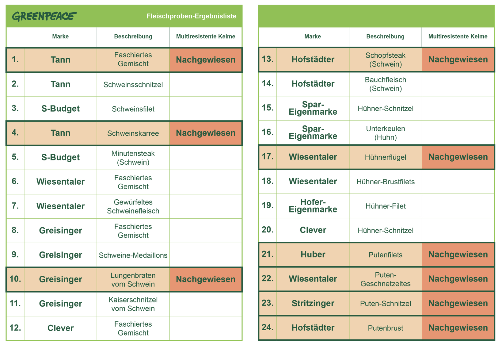 Greenpeace hat 24 abgepackte Fleischwaren von Schwein, Huhn und Pute aus heimischen Supermärkten vom Lebensmittellabor der AGES (Österreichische Agentur für Gesundheit und Ernährungssicherheit) auf multiresistente Keime testen lassen. In neun der 24 Fleischwaren, also über einem Drittel, wurden multiresistente Erreger nachgewiesen. Bei Schweinefleisch waren vier von 14 Produkten belastet. Beim Hühnerfleisch war eine Probe von sechs positiv. Bei Putenfleisch fanden sich gar in allen vier Fleischwaren multiresistente Erreger. Der Test zeigt auch, dass das AMA-Gütesiegel kein Garant gegen multiresistente Keime im Fleisch ist: von 16 Produkten mit dem AMA-Gütesiegel waren sechs belastet.