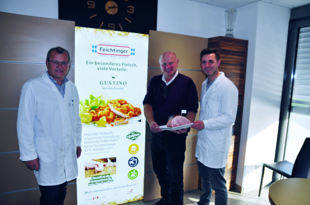 Ein Gustino-Partner der ersten Stunde ist die Fleischerei Feichtinger aus Schärding. Seniorchef Johann Feichtinger war von Anfang an begeistert: „Die Gustino-Schweine haben durch die hochwertige Fütterung ein besonders gutes, kerniges Fett und ein saftiges Fleisch. Und ganz wichtig, das Fleisch ‚schweindelt‘ nicht nach Stall. Das fühlt sich für mich als Fleischer einfach besser an.“ Eine Meinung, die auch Juniorchef Julian Feichtinger und Geschäftsführer Gerhard Schmid hundertprozentig unterstützen: „Das Fleisch ist kompakter, der Speck setzt sich nicht ab, die Marmorierung ist ausgesprochen perfekt. Damit eignet sich das Gustino-Schweinefleisch mit den Modulen Tierwohl und Klimafit perfekt für die Frischfleischtheken in unseren fünf Geschäften. Auch für die Schinken- und Wurstproduktion ist das Gustino-Schweinefleisch hervorragend geeignet. Es überzeugt durch die optimale Wasserhaltefähigkeit und den idealen ph-Wert.“