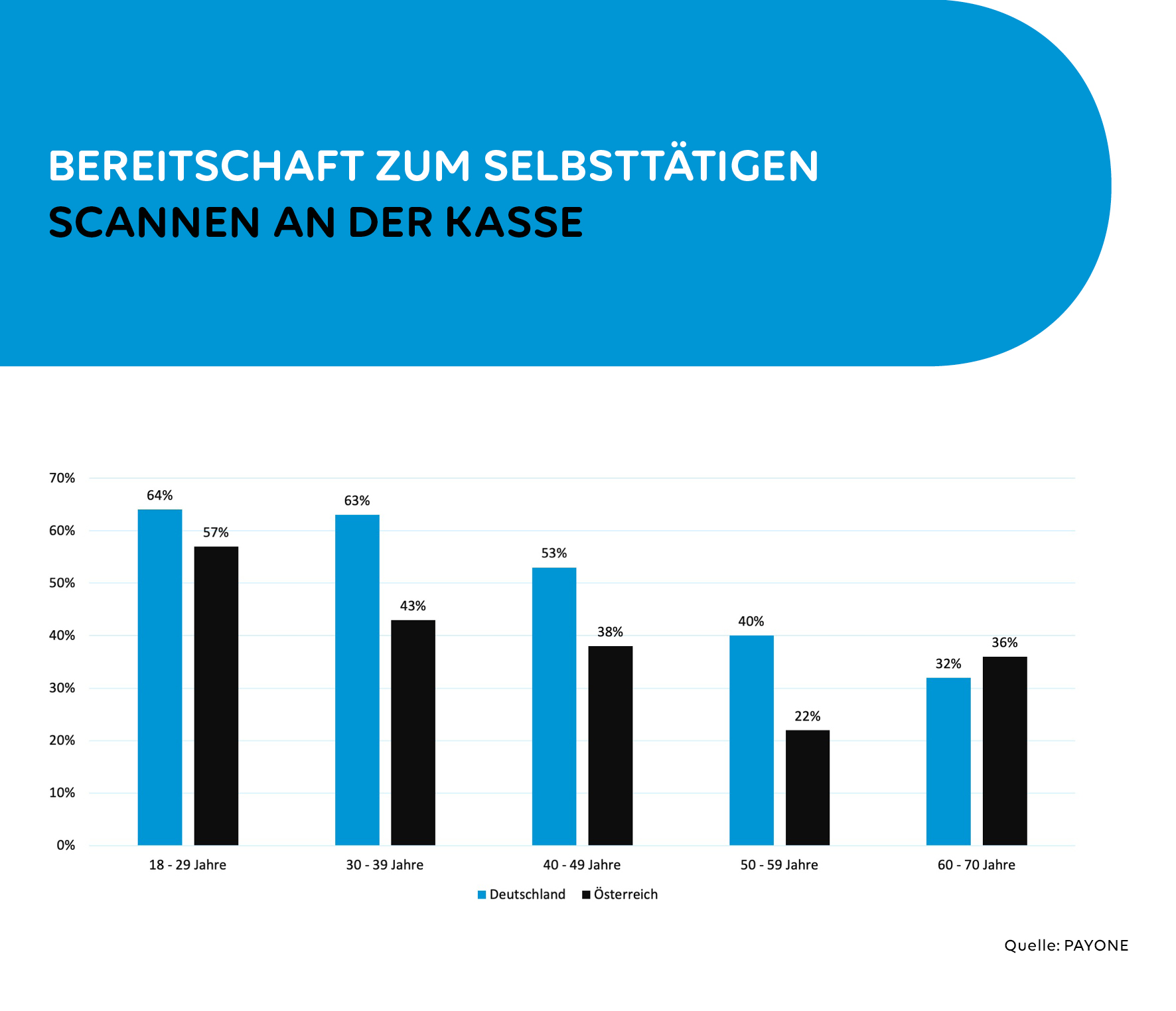 In der Gruppe der 60-70-jährigen Senioren sind die Österreicher diejenigen, die mit 36% gegenüber 32% in der deutschen Vergleichsgruppe weniger Berührungsängste zeigen, ihre Einkäufe selbst zu scannen und zu bezahlen.