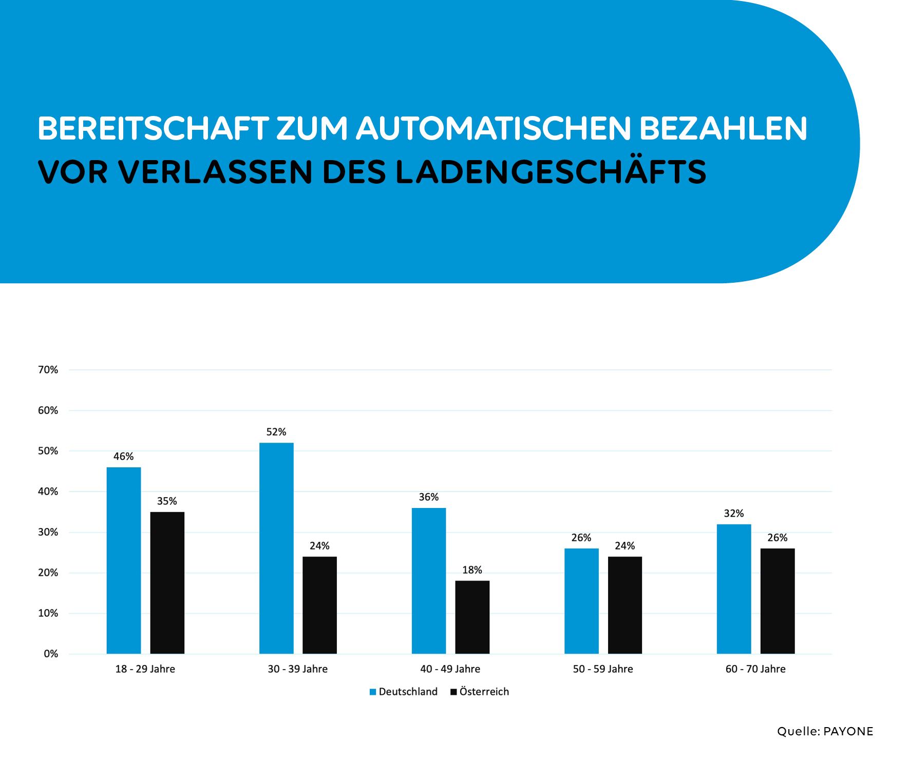 Diese Beobachtung zieht sich in der der Gruppe der 50-59-Jährigen weiter: 31% der Deutschen, aber nur 20% der Österreicher halten diese technische Lösung für wünschenswert. Die 60-70-Jährigen in Deutschland stehen mit 26% dieser Art des digitalen Bezahlens eher vorsichtig gegenüber. Die österreichische Vergleichsgruppe gibt sich aber mit nur 19% ungleich skeptischer.