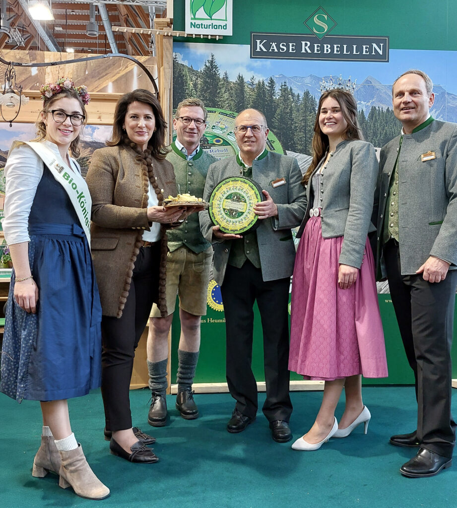 Hoher Besuch bei den Käserebellen: Michaela Kaniber, Bayerische Staatsministerin für Ernährung, Landwirtschaft, Forsten und Tourismus, kam zum Stand der Käserebellen auf der Biofach 2025. Auf dem Bild: Bio-Königin Anna-Lena II., Michaela Kaniber, Alois Hager, Sepp Krönauer, Bayerische Milchkönigin Elisabeth Heimerl und Andreas Geisler (v. l.). © Beigestellt