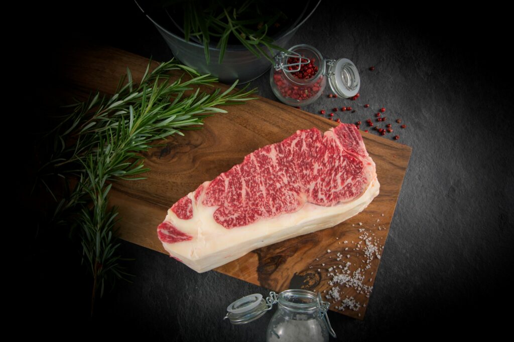 Das Fleisch zeichnet sich durch eine gleichmäßige, intensive Marmorierung aus. Die Marmorierung entscheidet über die Qualität. Je höher, umso hochwertiger. Diese Fettverteilung sorgt bei reinrassigem Kobe-Rind für den satten und vollen Geschmack.