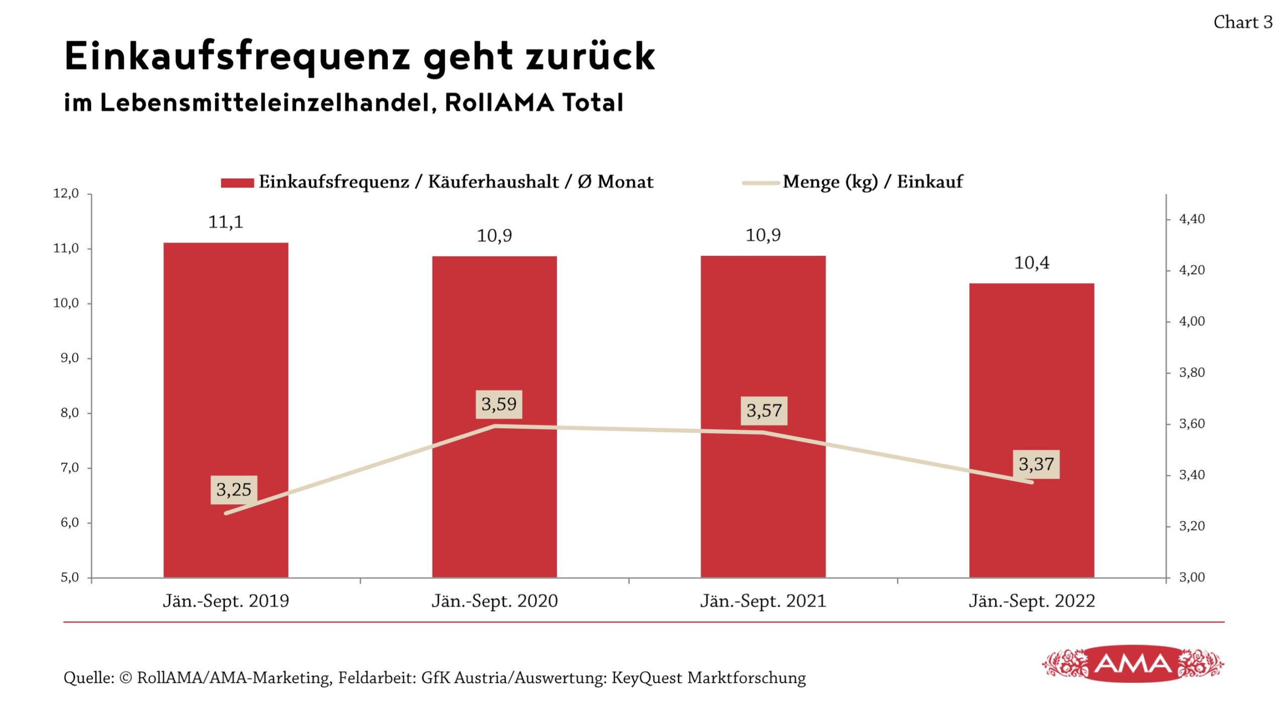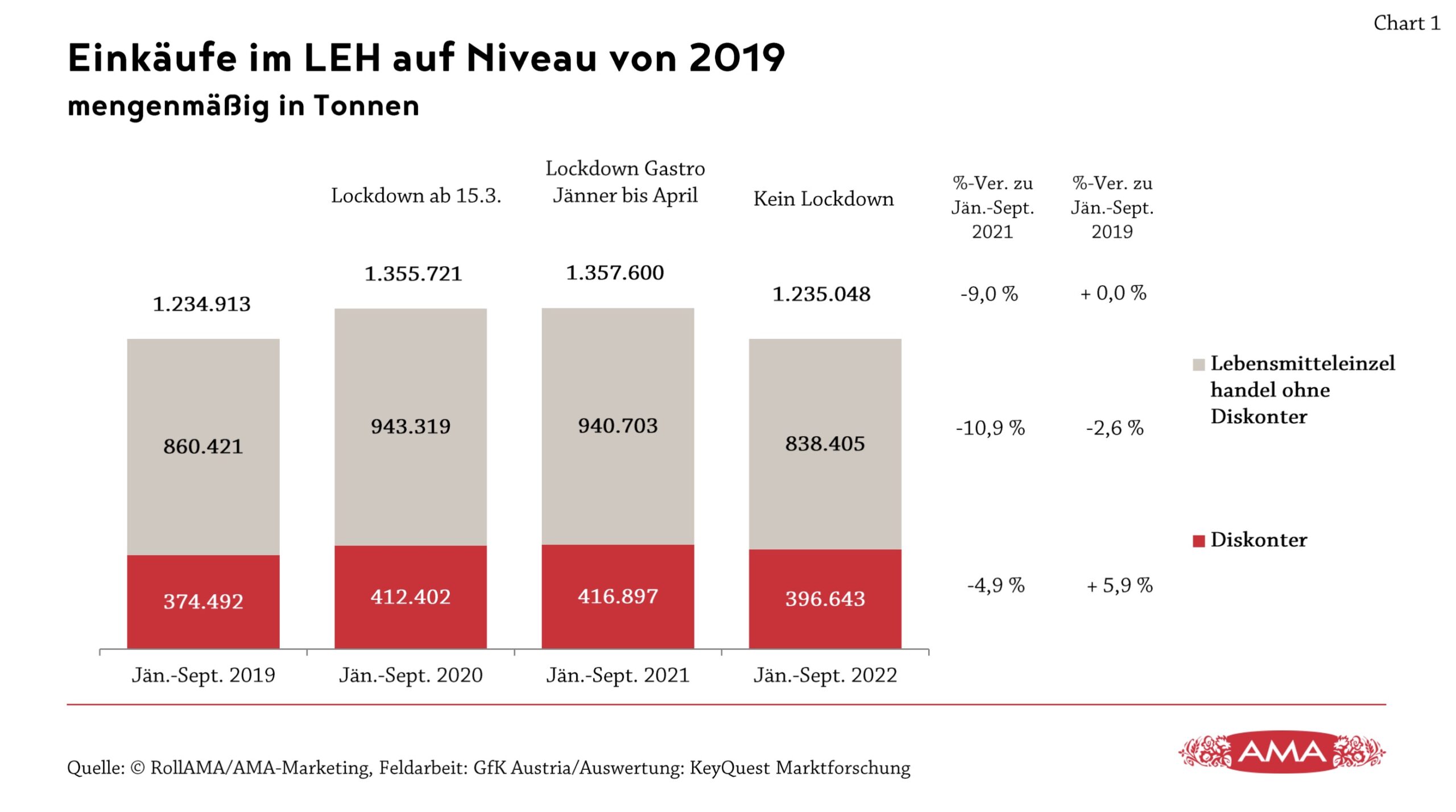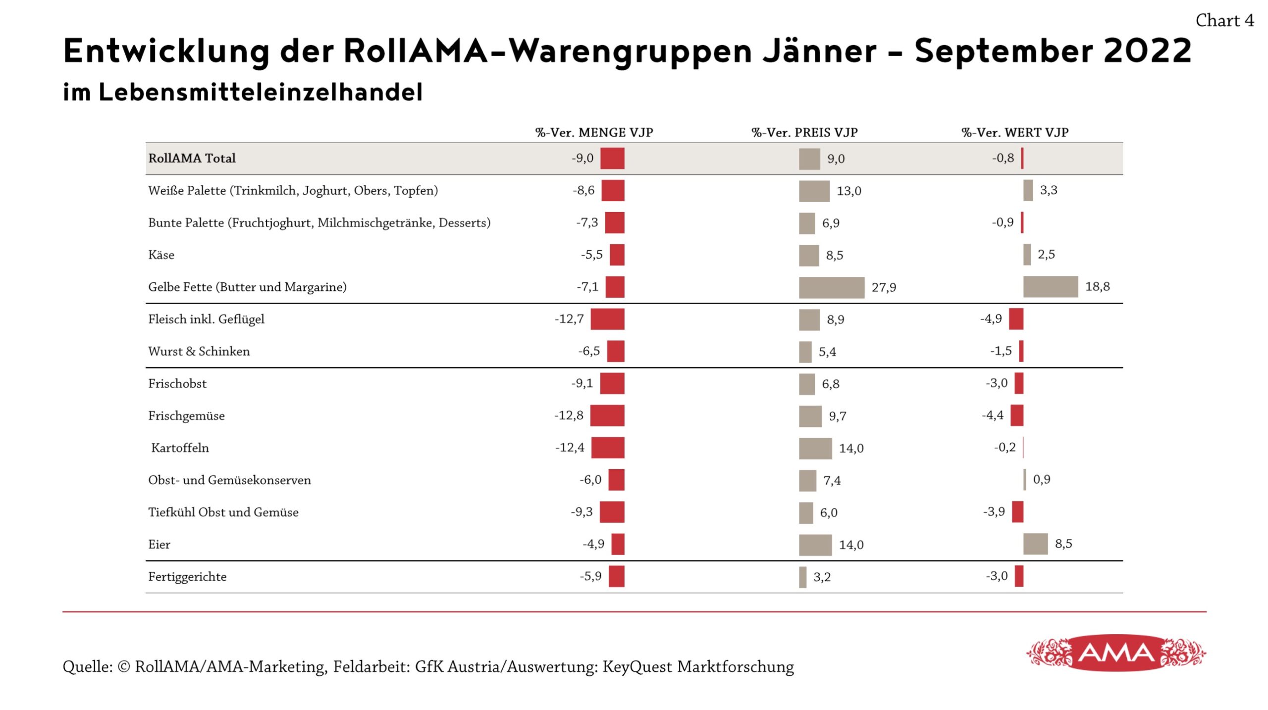 Die Haushaltsausgaben für die RollAMA-Warengruppen im Lebensmitteleinzelhandel fielen von Jänner bis September 2022 um knapp ein Prozent gegenüber demselben Zeitraum im Vorjahr, die Mengen um neun Prozent. Gegenüber 2019 wurde um 13 Prozent mehr ausgegeben, die Einkaufsmengen im LEH sind auf das damalige Niveau gefallen.