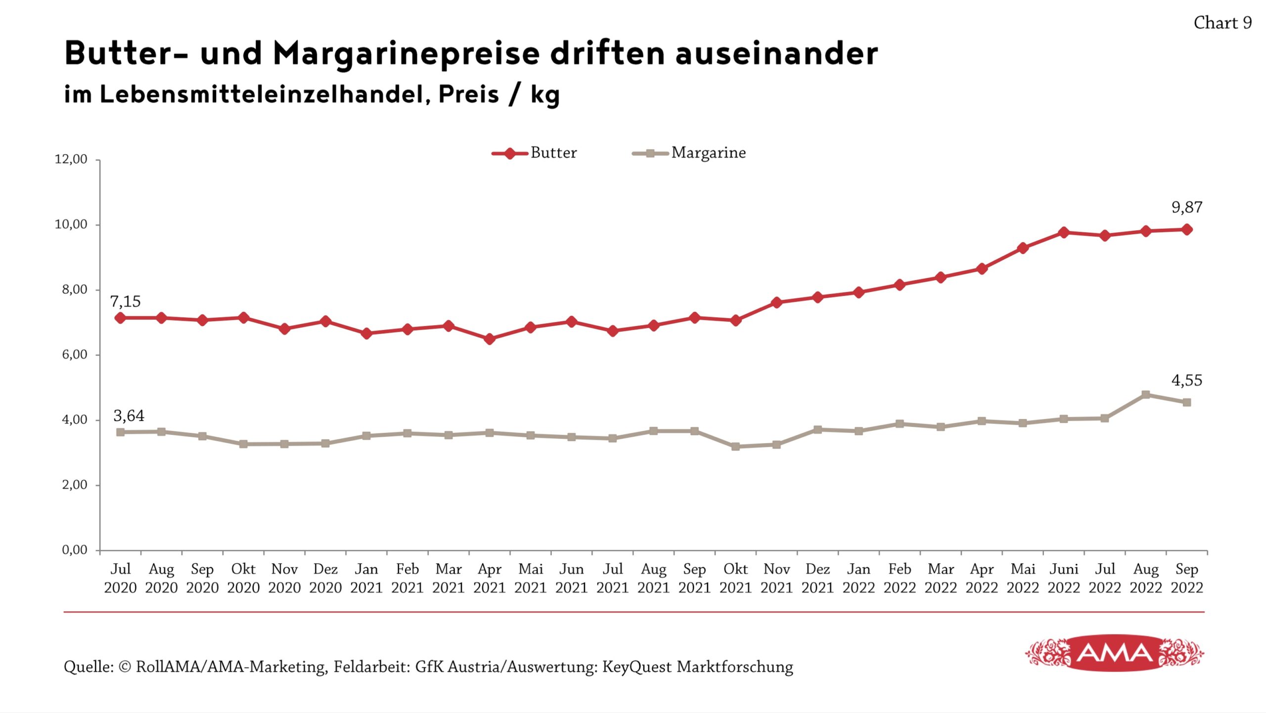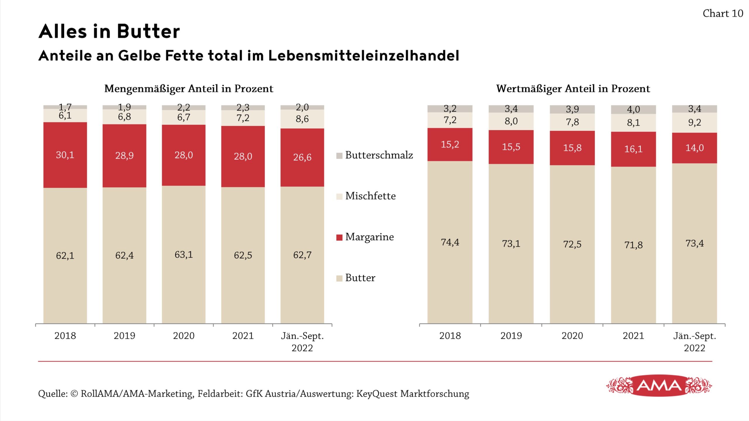 Trotz massiver Preissteigerungen bei Butter auf im Schnitt 9,90 Euro pro kg im September und nur wenig Bewegung bei Margarine bleiben die Österreicher ihrem Butterbrot treu. 63% der Käufe in dieser Kategorie entfallen auf das Produkt rein tierischen Ursprungs, 27% auf seinen pflanzlichen Vertreter. Leichte Zuwächse gibt es bei den Mischfetten mit tierischen und pflanzlichen Zutaten.