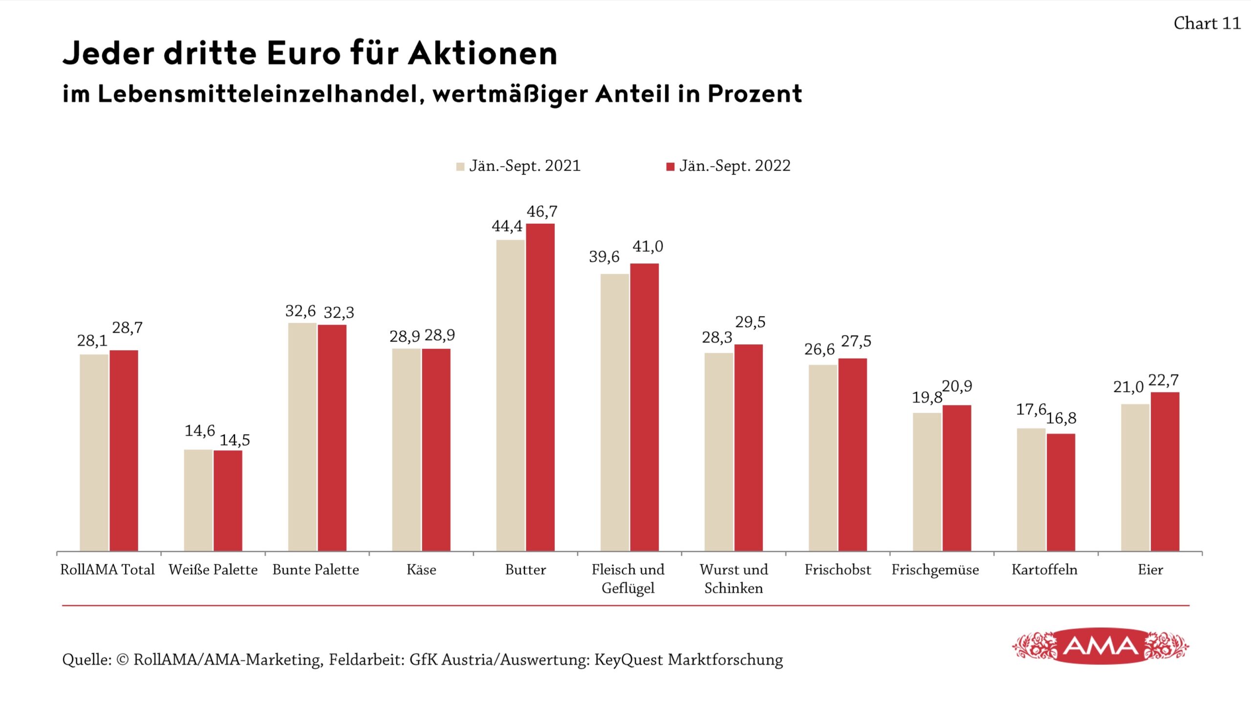 Gleichermaßen wie die Preise steigen auch die Einkäufe in Aktion. Bald ein Drittel der Ausgaben in den RollAMA-Kategorien entfallen auf Aktionsprodukte. Butter und Fleisch bleiben die Kategorien mit den höchsten und steigenden Aktionsanteilen.