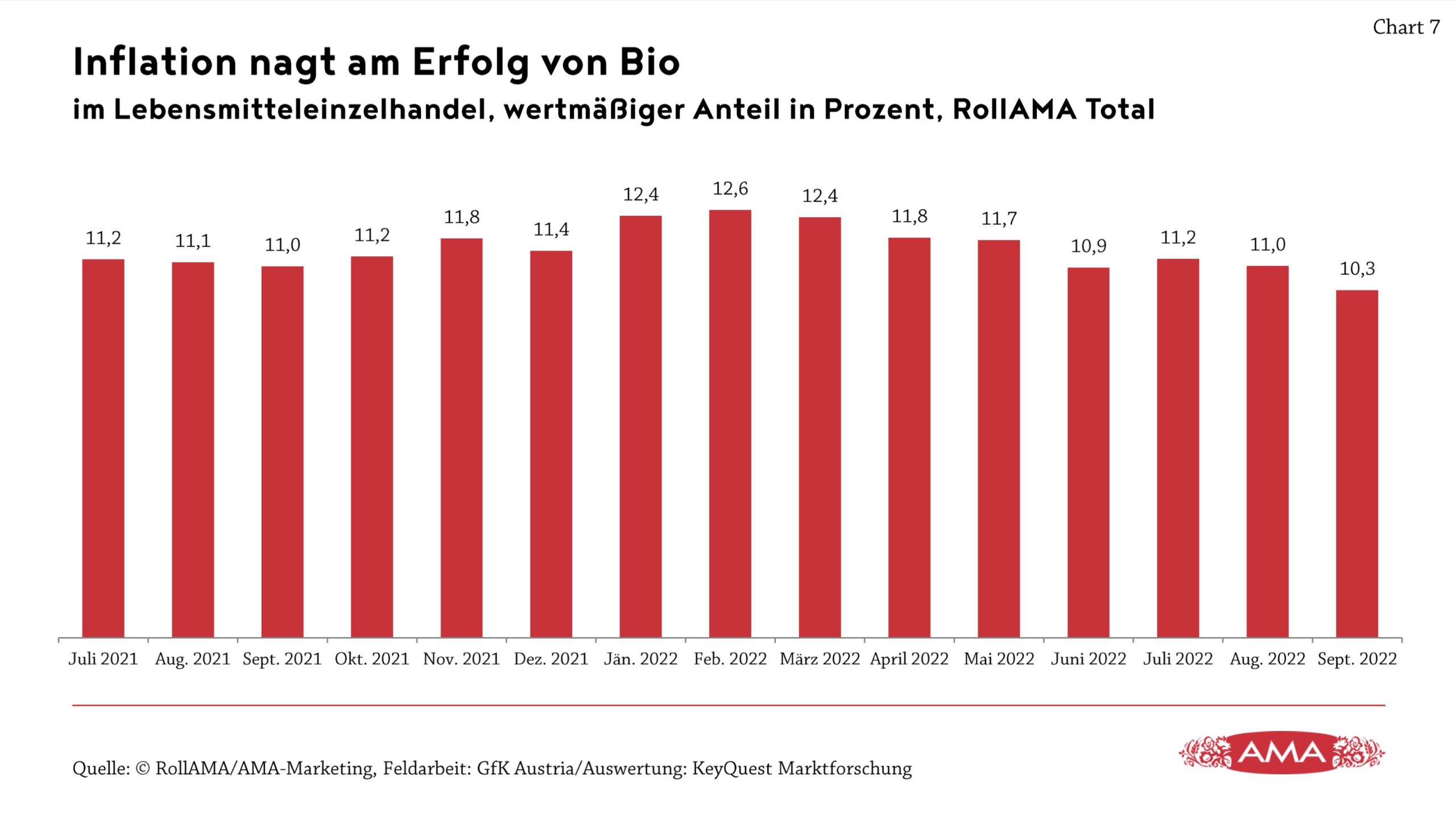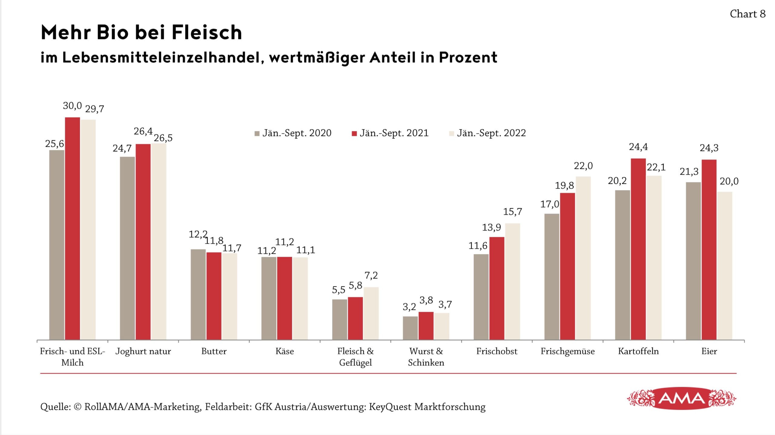 Im Verlauf der Monate Juli 2021 bis September 2022 ging der Anteil mit starken Preissteigerungen etwas zurück und fiel im September auf insgesamt zehn Prozent. Bei Obst und Gemüse ist die Bionachfrage ungebrochen, während sie bei Eiern sinkt, wohl auch weil es immer mehr Angebot an etwas günstigeren Tierwohleiern aus konventioneller Landwirtschaft gibt.